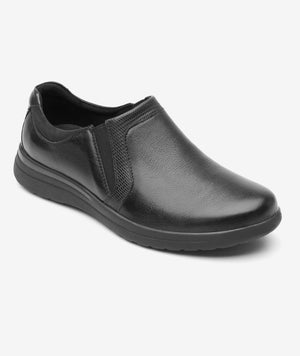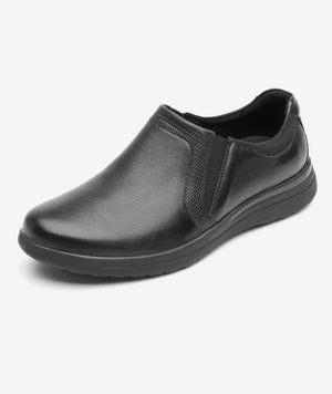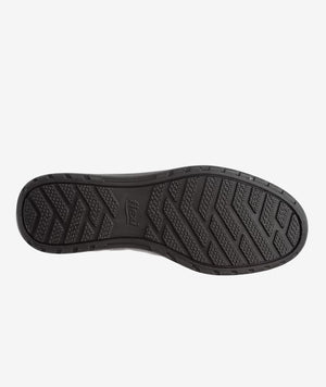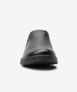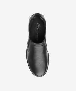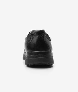 Flat casual de confort de piel negra con preciosa piel con grano visible en combinación con otras texturas. Se ajusta con elásticos laterales.